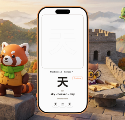 Every character is colour-coded: warm for brand new, cool for still-practicing. Tap any character to see its meaning, pronunciation, and stroke order.